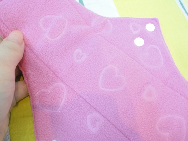 布衛生棉的是粉紅色的鋪棉哦~上面還有愛心形狀的防回滲(一般衛生棉上的壓紋是為了防回滲而做的)